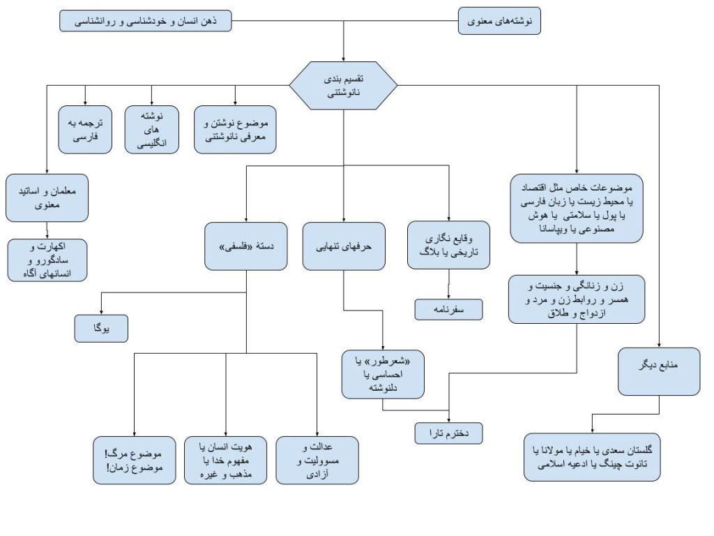 این ها تقسیم بندی هایی است که من با ذهن خودم در این لحظه وقتی از بیرون به نانوشتنی نگاه میکنم میسازم. شاید هر ذهنی آنها را از دید خودش ببیند و تقسیمبندی کند.